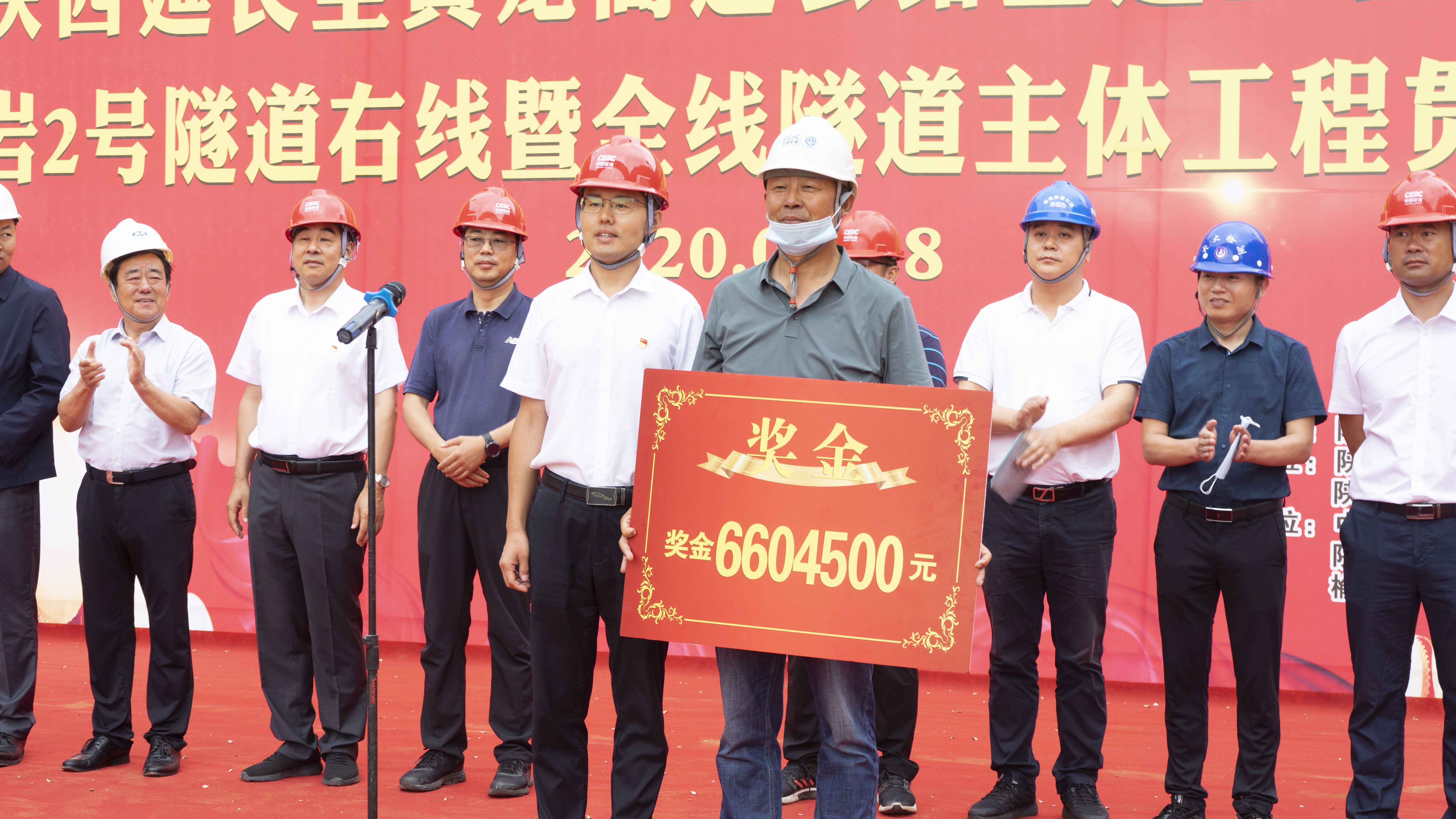 參加我公司隧道貫通儀式的有總包部、駐地辦、總監(jiān)辦、業(yè)代處、設(shè)計(jì)院、延黃高速公路項(xiàng)目公司,以及陜西省交通廳質(zhì)監(jiān)站等上級(jí)主管單位的領(lǐng)導(dǎo),在貫通儀式上級(jí)主管單位分別對(duì)我公司承建的延黃高速公路土建4標(biāo)段的工程施工進(jìn)度、工程質(zhì)量和安全文明施工給與了充分的肯定和贊許,并希望我分部繼續(xù)努力、擔(dān)當(dāng)起延黃高速公路項(xiàng)目的排頭兵,儀式最后項(xiàng)目公司總工程師王峰代表延黃項(xiàng)目公司給我分部頒發(fā)了6604500元的獎(jiǎng)金,以資鼓勵(lì)。