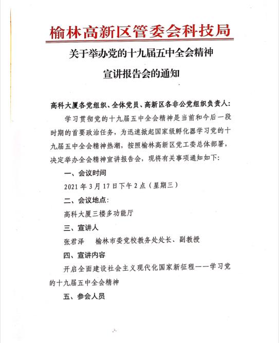 2020年10月26日至29日,中國共產(chǎn)黨第十九屆中央委員會第五次全體會議在北京召開。這次全會是在全面建成小康社會勝利在望、全面建設(shè)社會主義現(xiàn)代化國家新征程即將開啟的重要歷史時刻召開的一次十分重要的會議。因此,榆林高新區(qū)黨工委總體部署,決定舉辦全會精神宣講報告會議,將全面深入學(xué)習(xí)黨的十九屆五中全會精神作為最重要的政治任務(wù)抓牢抓實。