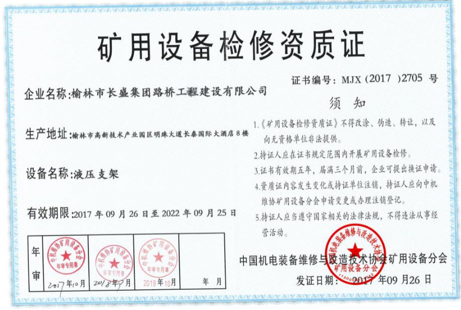 礦用設(shè)備檢修資質(zhì)-液壓支架