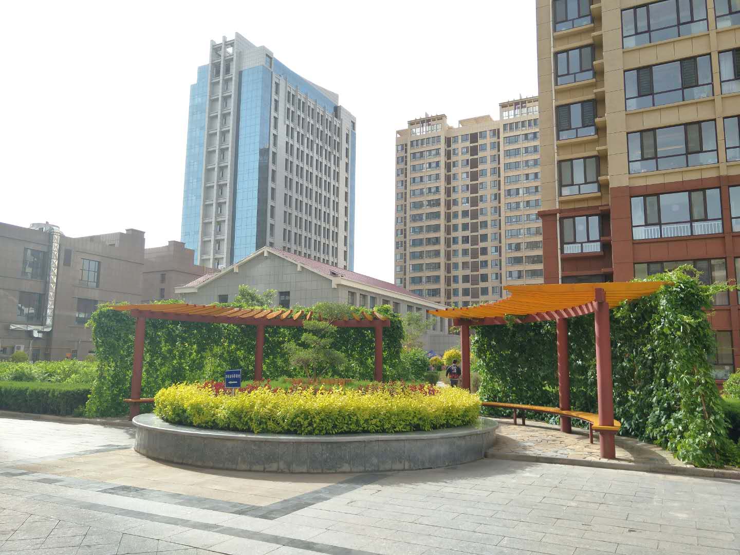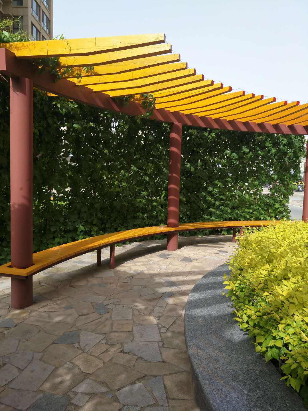 室外條形座椅以及南門(mén)涼亭涂刷橘黃色油漆,使人心情愉悅、放松,搭配上郁郁蔥蔥的爬山虎,為業(yè)主夏季納涼提供了一個(gè)好去處。