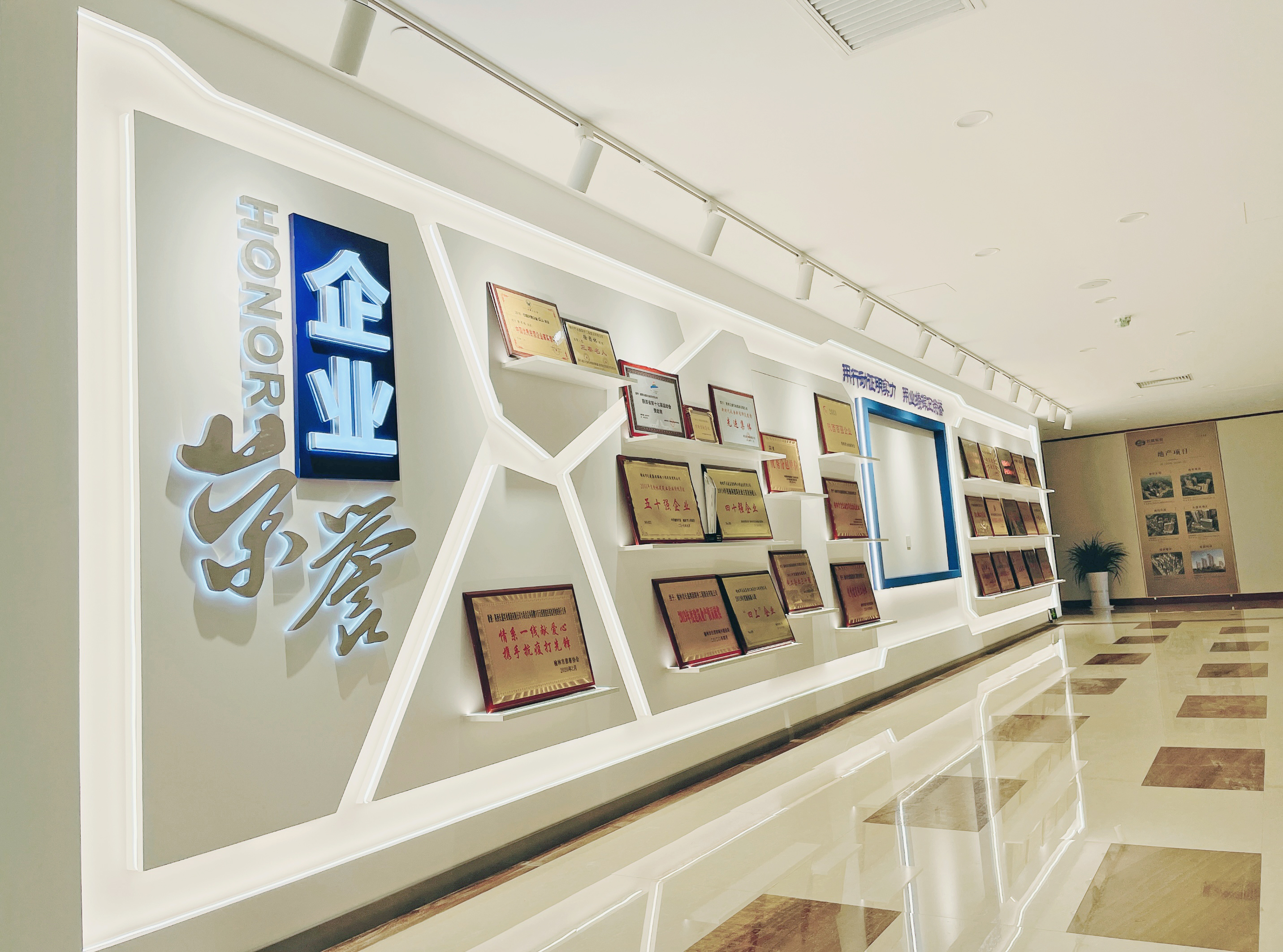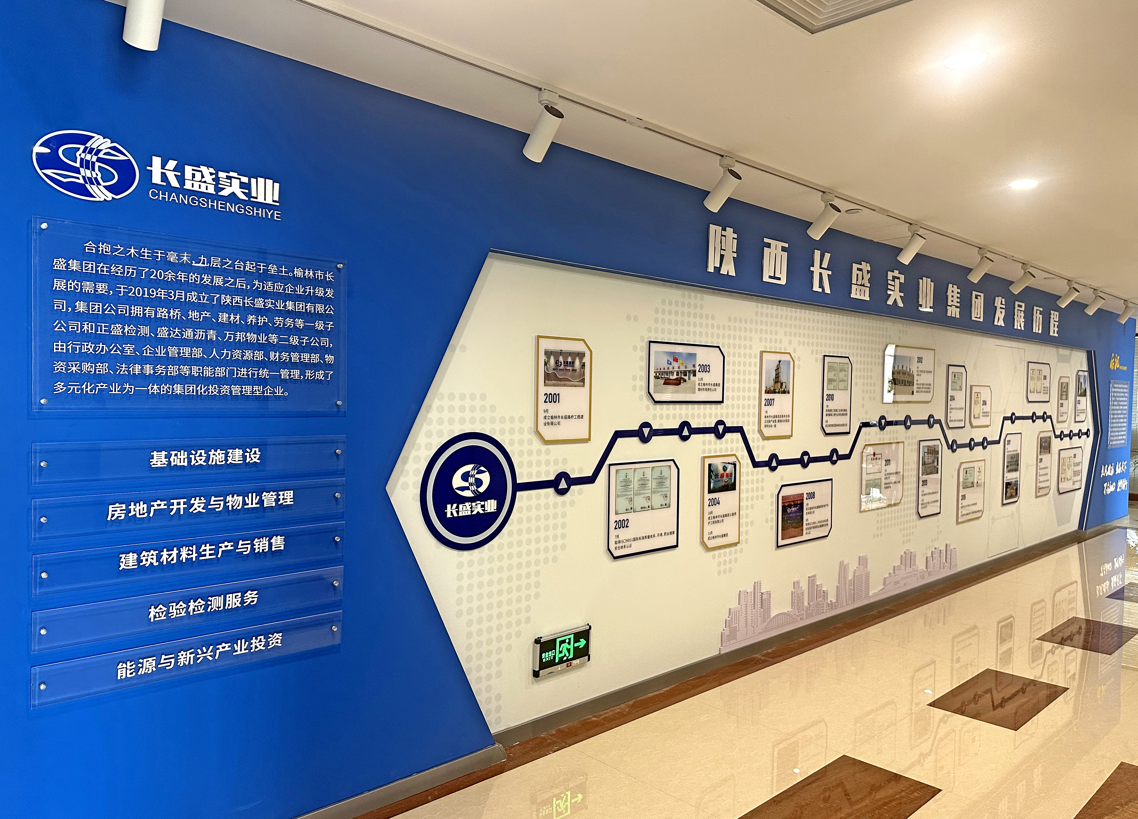 文化墻依托走廊,呈H型分布,內(nèi)容展示了企業(yè)簡介、發(fā)展歷程、工程案例、員工風采等,色調(diào)以沉穩(wěn)內(nèi)斂的寶石藍為主色、低調(diào)輕奢的時尚金為配色,整體簡單大氣,充分彰顯了企業(yè)高瞻遠矚、成熟睿智的發(fā)展方略和勇立時代潮頭、奮勇搏擊的豪邁氣魄,準確闡釋了“開拓創(chuàng)新、穩(wěn)健發(fā)展”的企業(yè)理念。