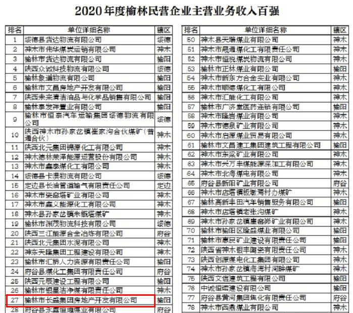 喜報(bào)|長(zhǎng)盛地產(chǎn)、成建路橋榮登“榆林市2020年度‘五上’企業(yè)主營(yíng)業(yè)務(wù)收入排行榜”